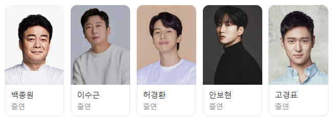 - 안보현 그동안 갈고닦은 실력으로 수셰프로 등극! 경력직의 노하우로 신입들 기강 잡는 출장 요리단 선배.